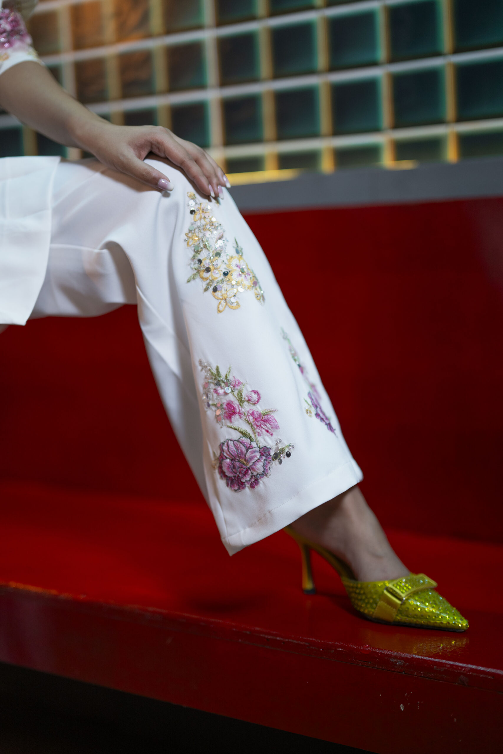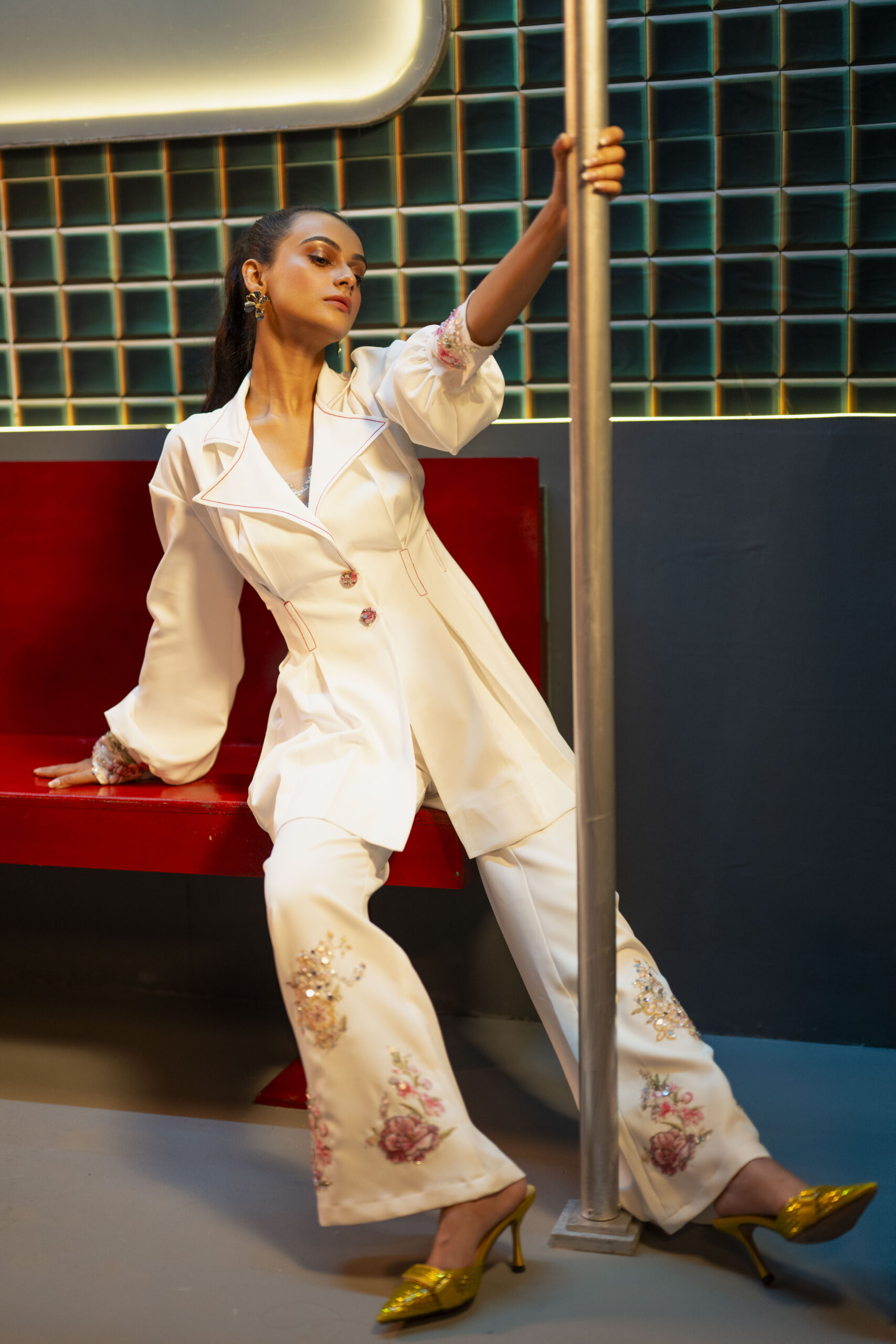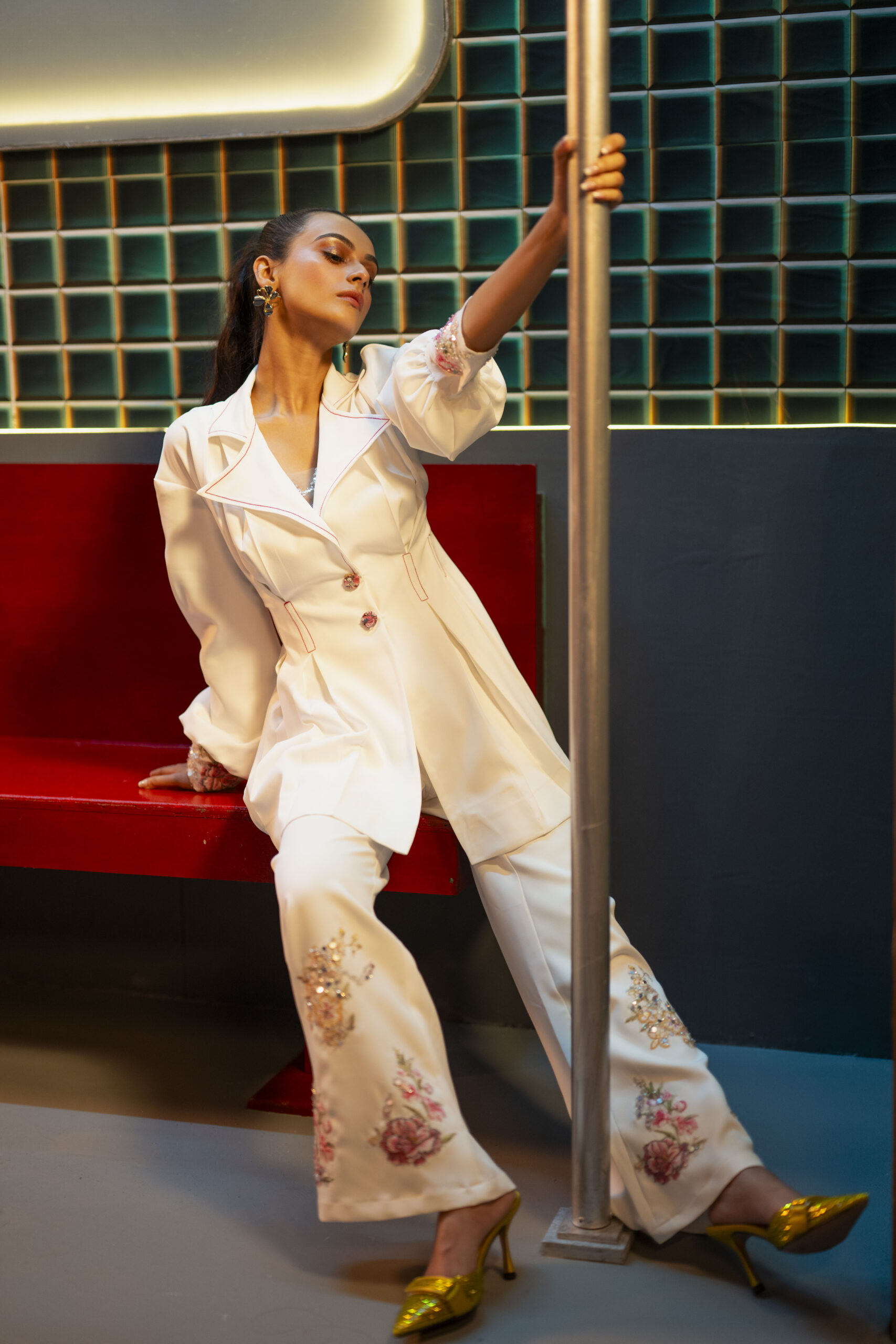 IMPORTED CORTTEN PANTS AND JACKET DETAILING WITH FLOWERS