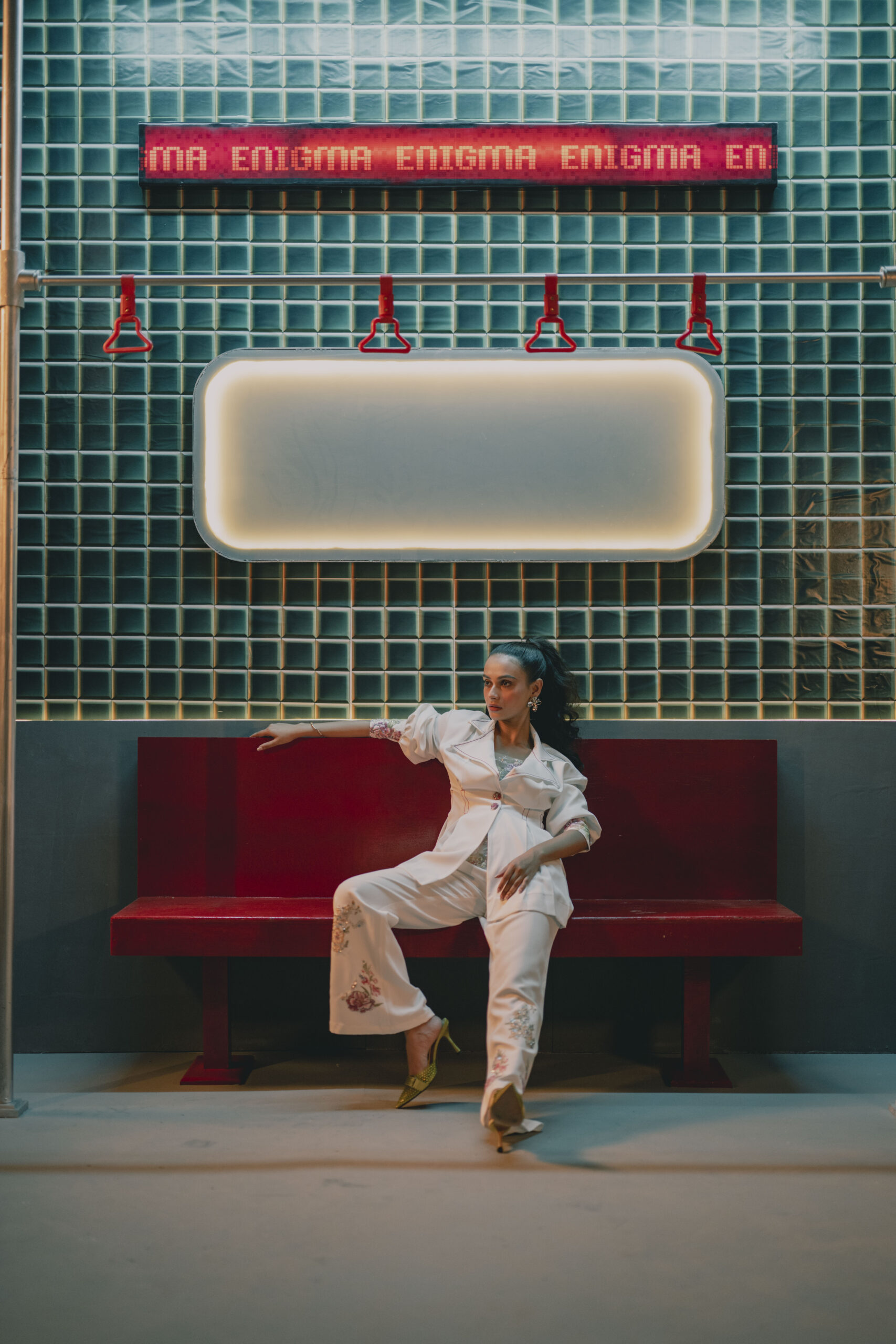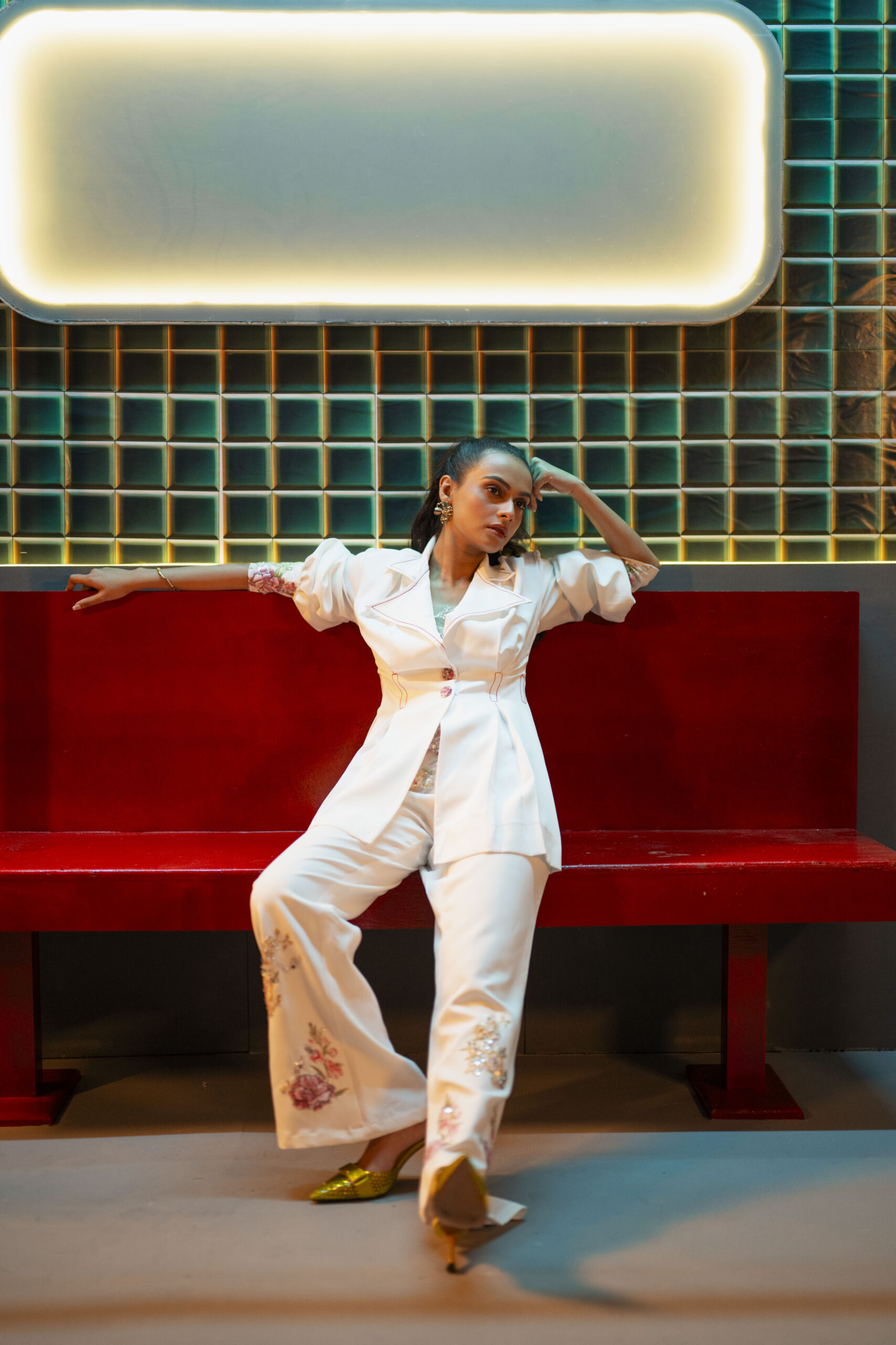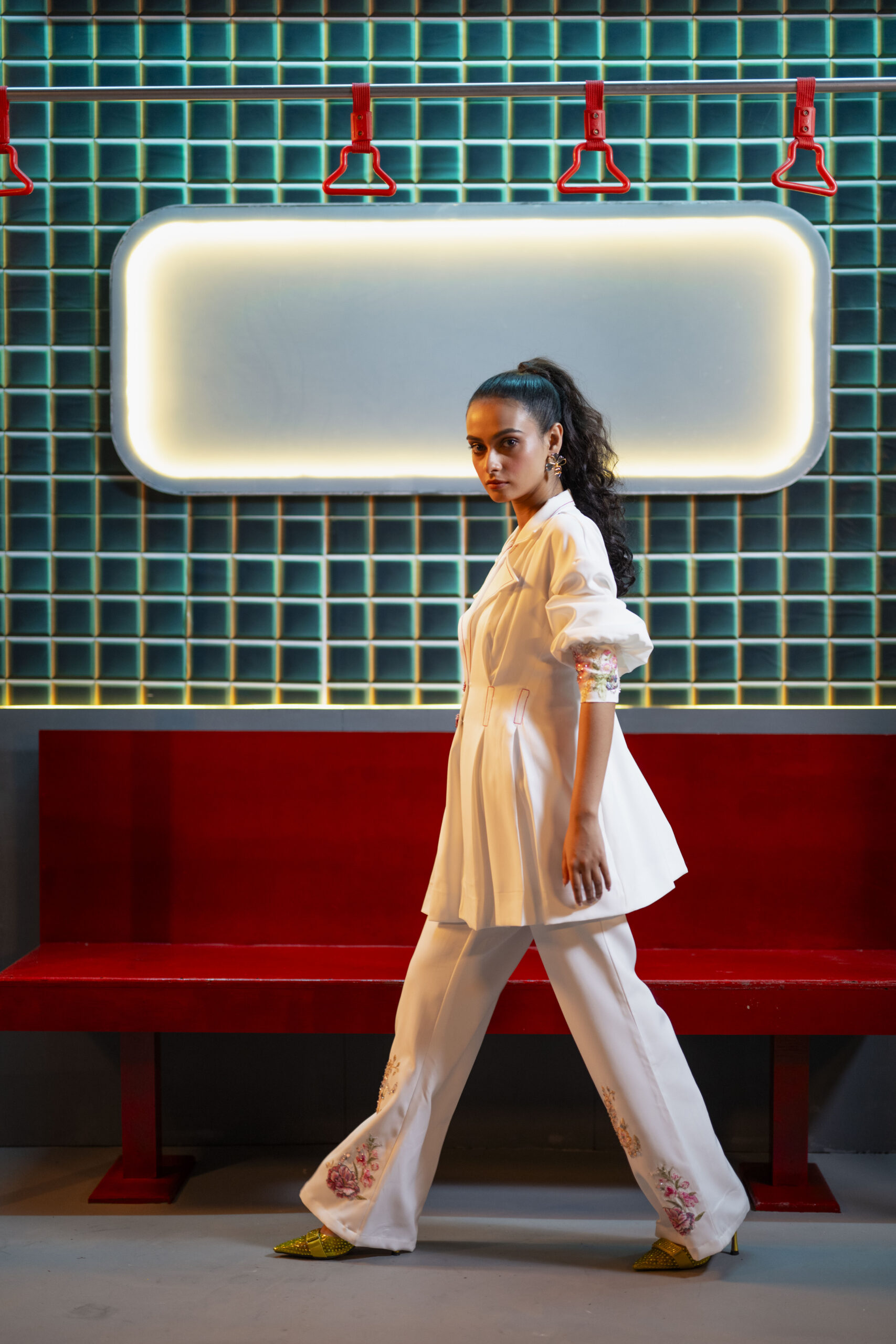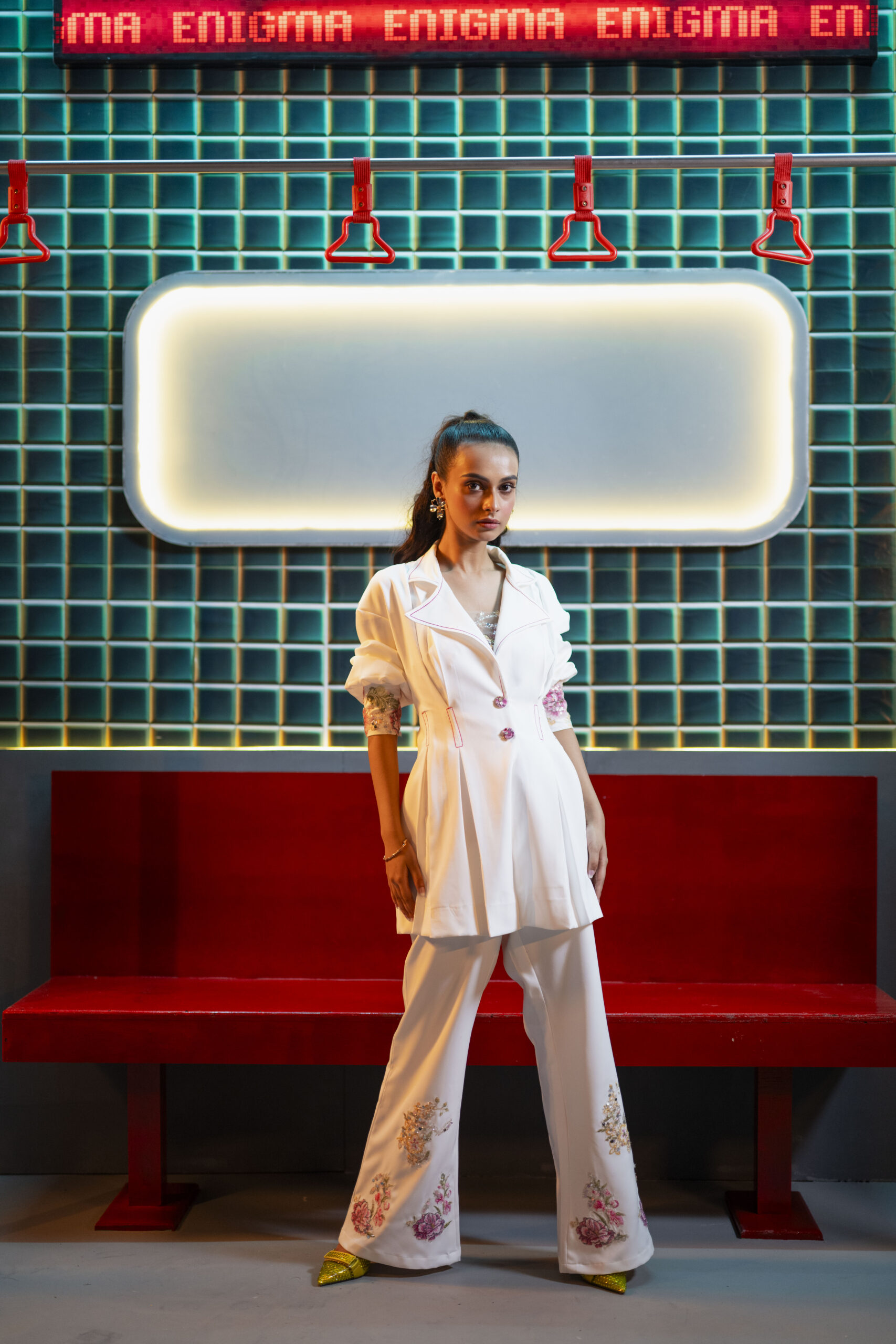 IMPORTED CORTTEN PANTS AND JACKET DETAILING WITH FLOWERS