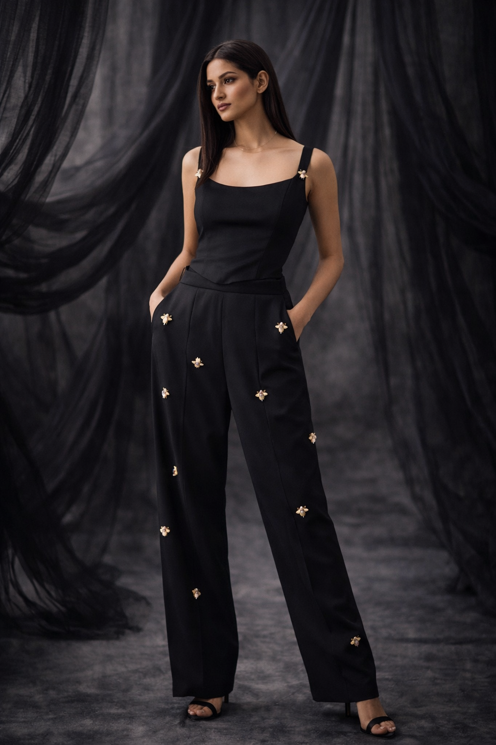 The embroidered bee motifs add subtle handcrafted detailing while maintaining the overall minimal aesthetic. The pants combine elegant tailoring with distinctive design elements.