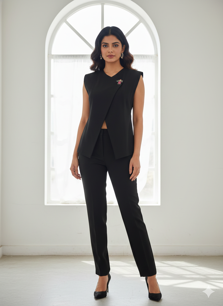 The waistcoat can be styled with pants, skirts, or layered over dresses for contemporary fusion styling.