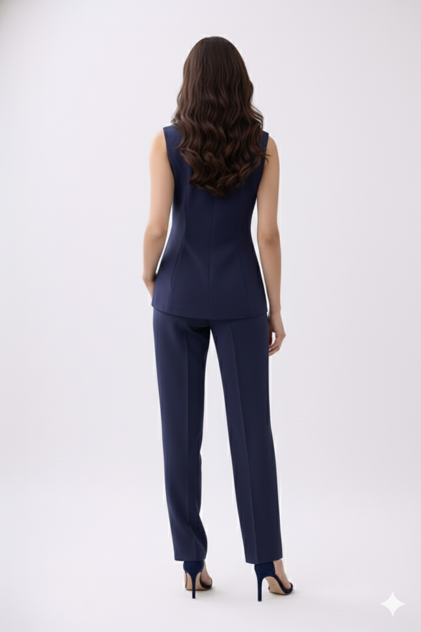 The embroidery adds delicate character to the piece, transforming a classic waistcoat into a statement garment. The clean tailoring ensures that the design remains elegant and refined.