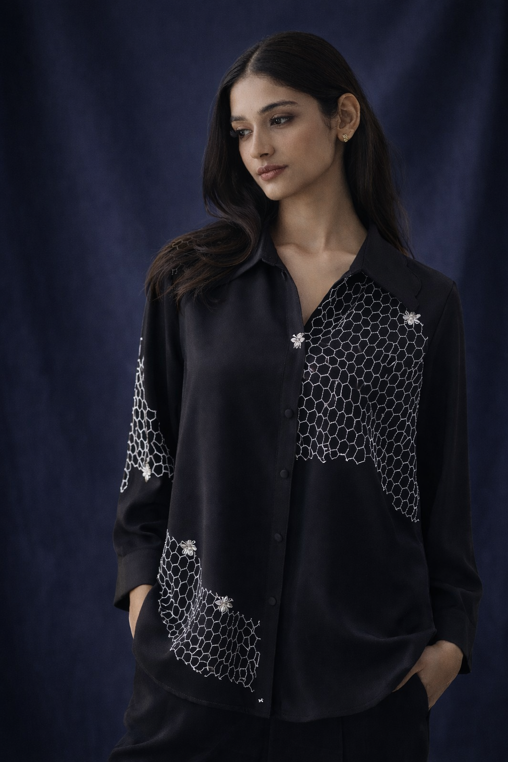 This shirt is crafted in imported fabric and features delicate embroidery combining honeycomb patterns with subtle bee motifs. The structured silhouette keeps the design polished while allowing the detailing to remain the highlight.