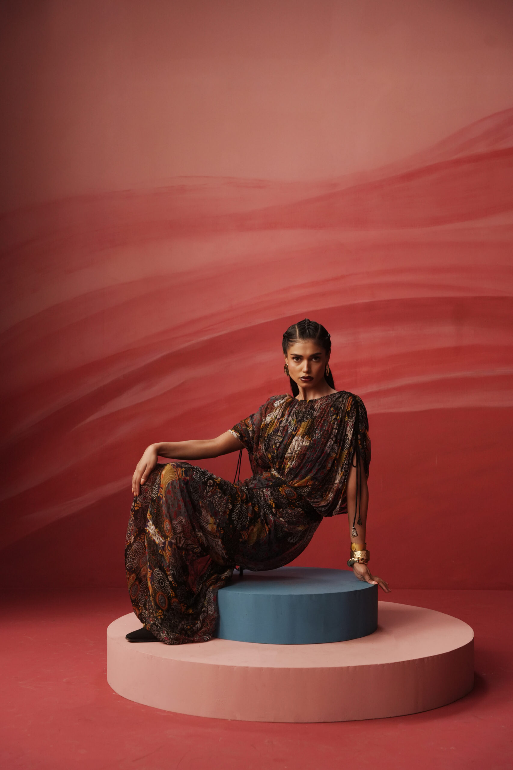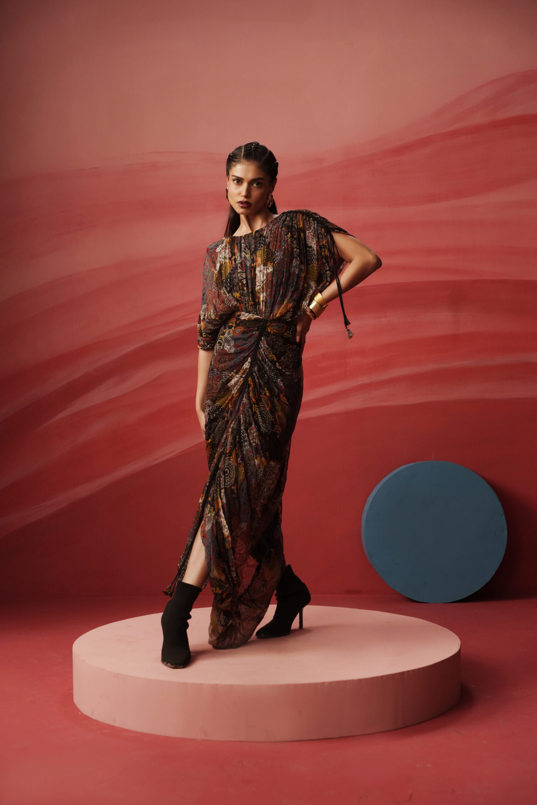 PRINTED DRAWSTRING LONG DRESS WITH A BUSTER