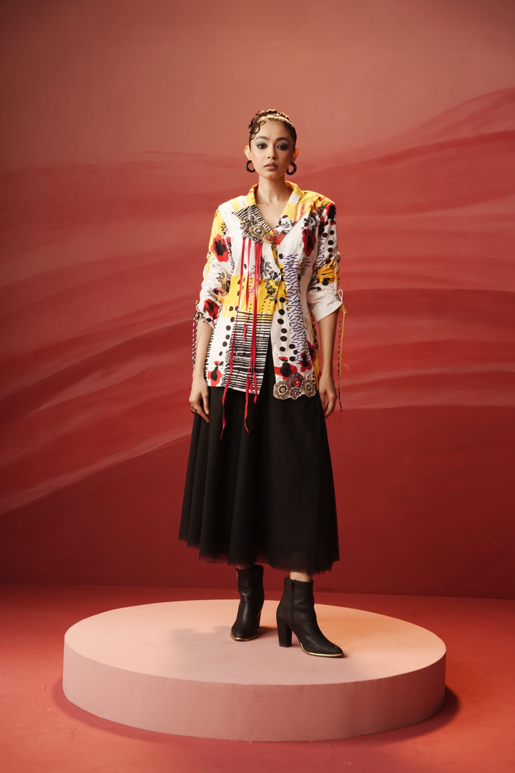 PRINTED BLAZER WITH BLACK NET TUILLE SKIRT