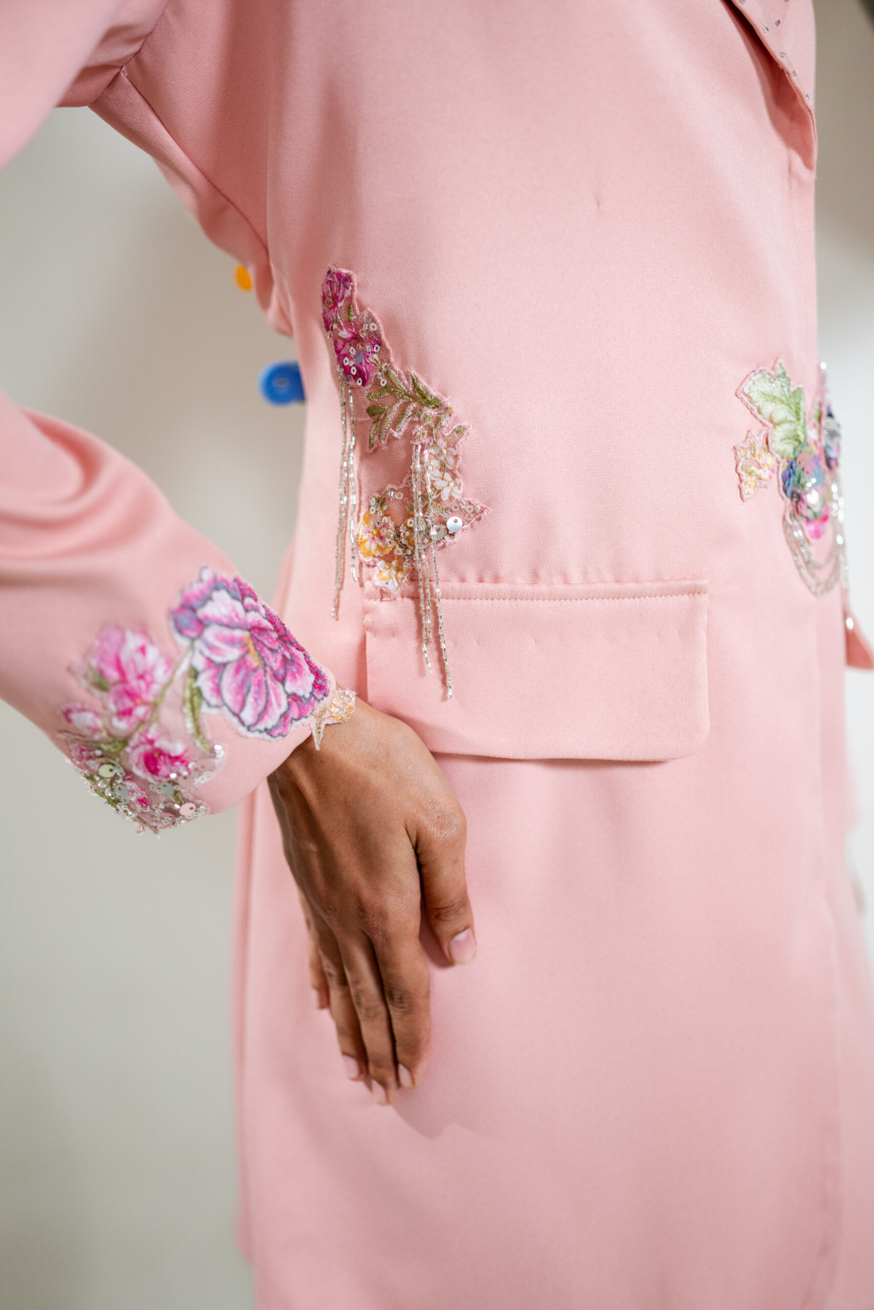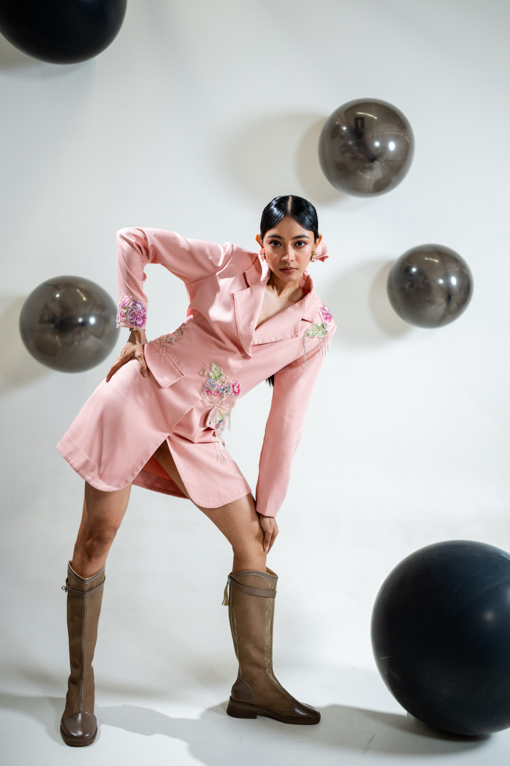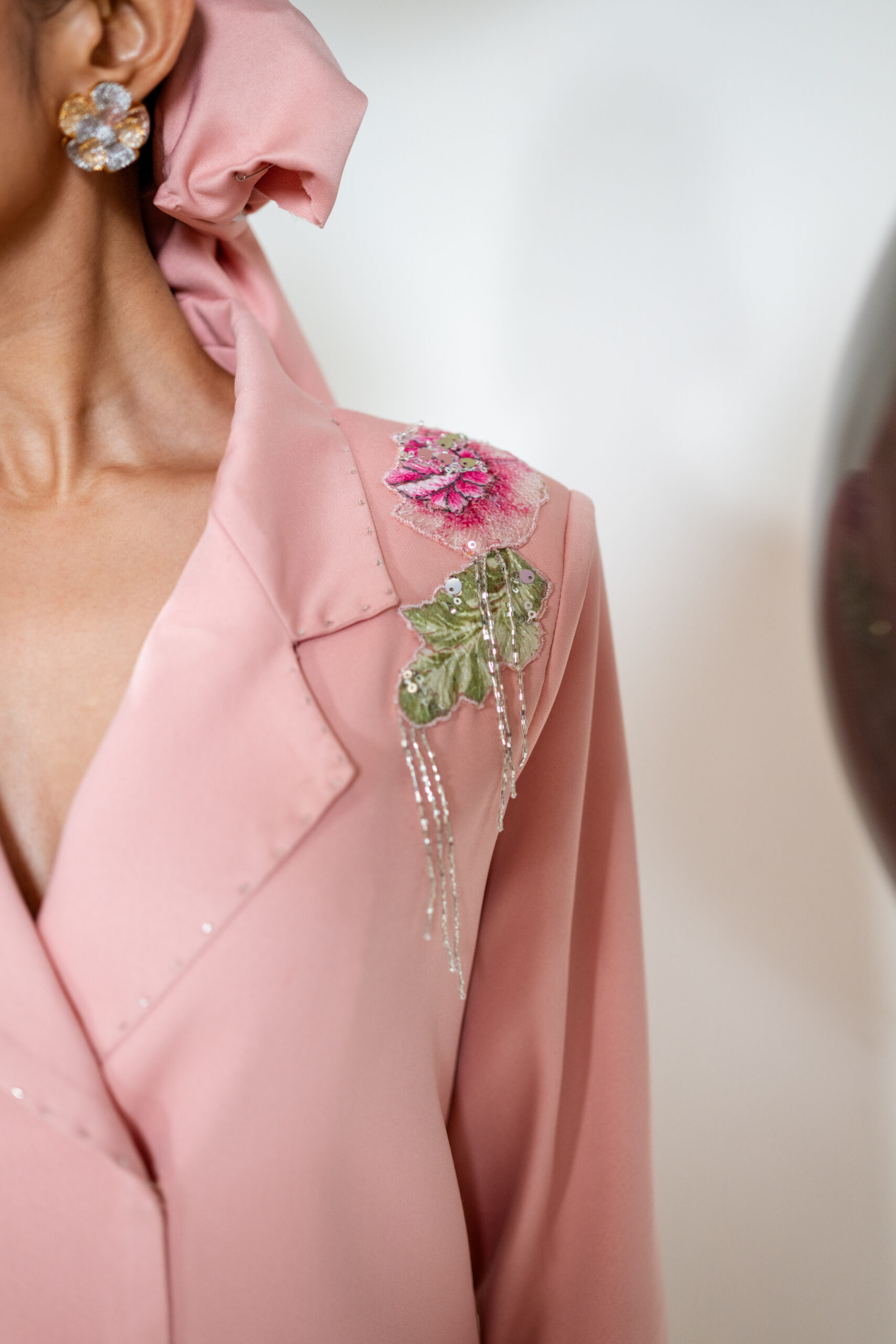 IMPORTED SATIN DRESS WITH FLOWER DETAILING