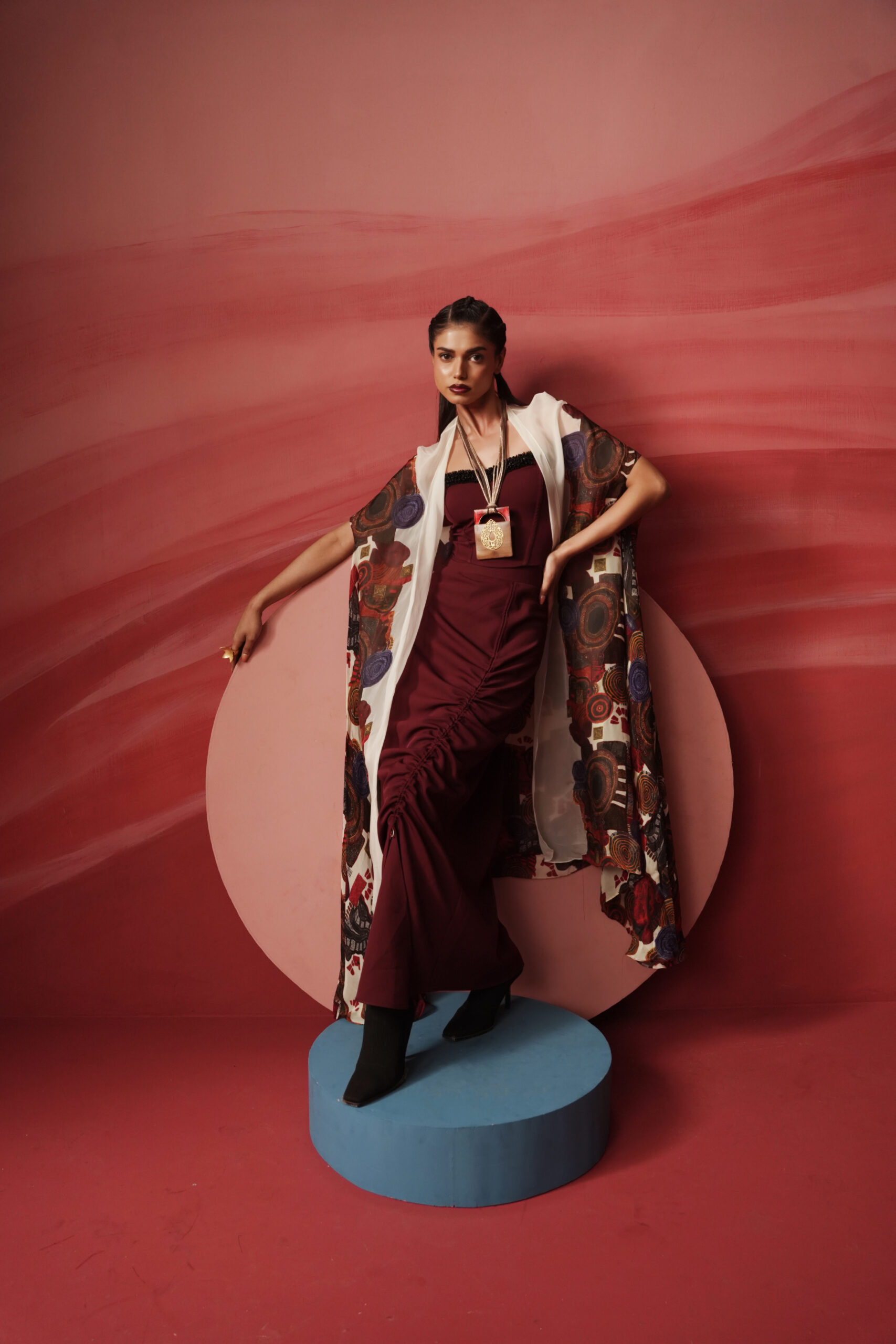 DRAWSTING DRESS WITH PRINTED LOG JACKET
