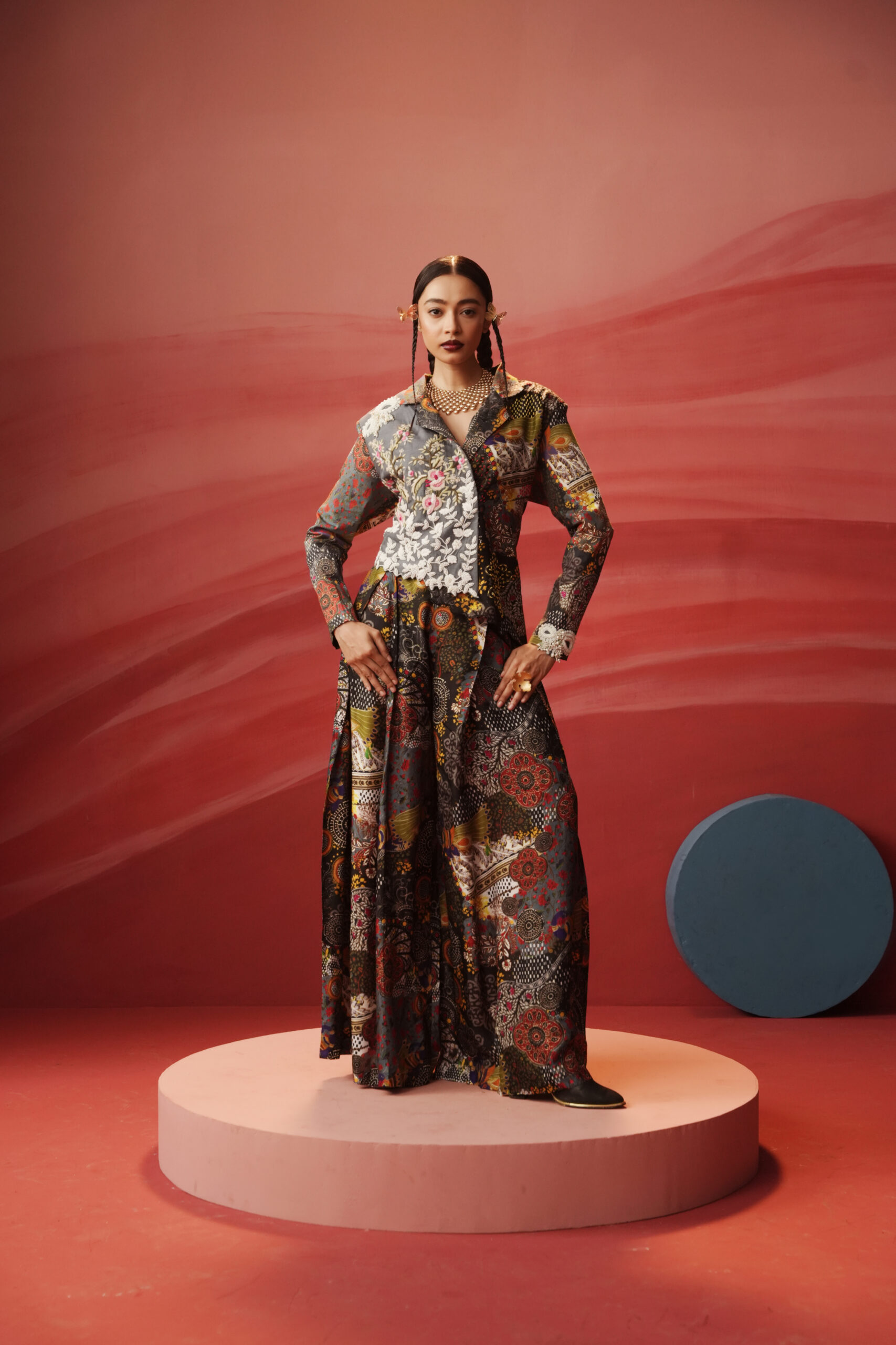 PRINTED PANTS WITH PRINTED ONE SIDE EMBROIDERY BLAZER
