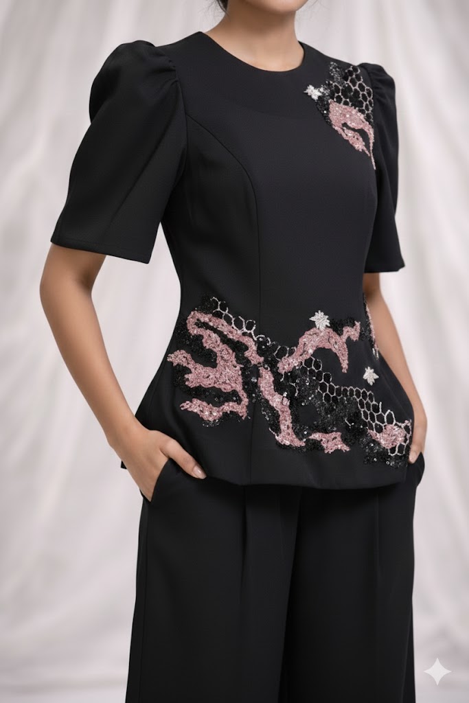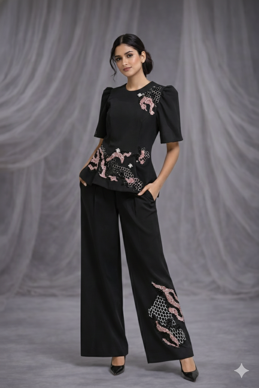 Together, the pieces create a contemporary outfit that blends structured tailoring with delicate embellishment.