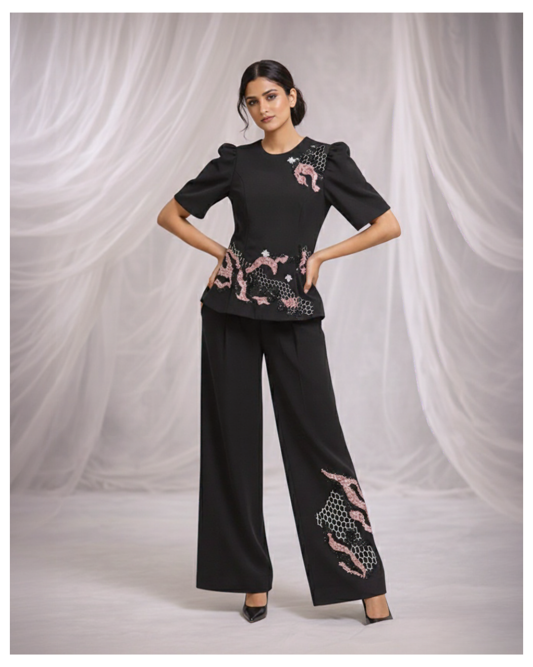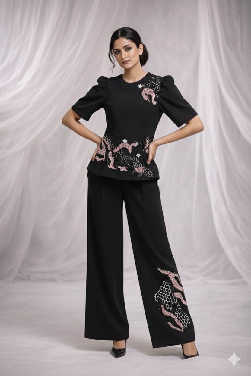 The garment is embellished with intricate bee motifs, honeycomb embroidery, and sequin accents that introduce layered craftsmanship. The bootcut pants provide balance and elongate the overall silhouette.