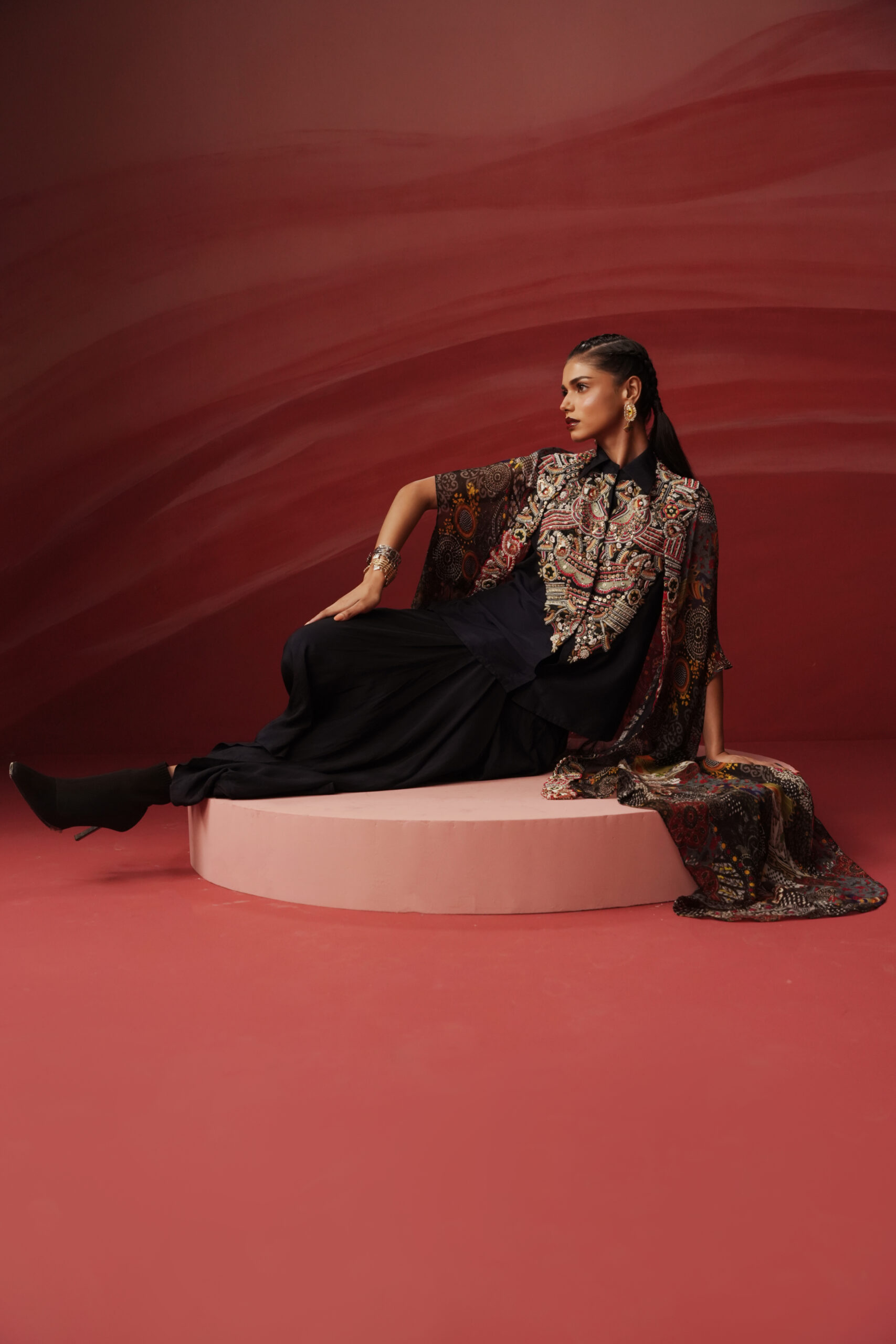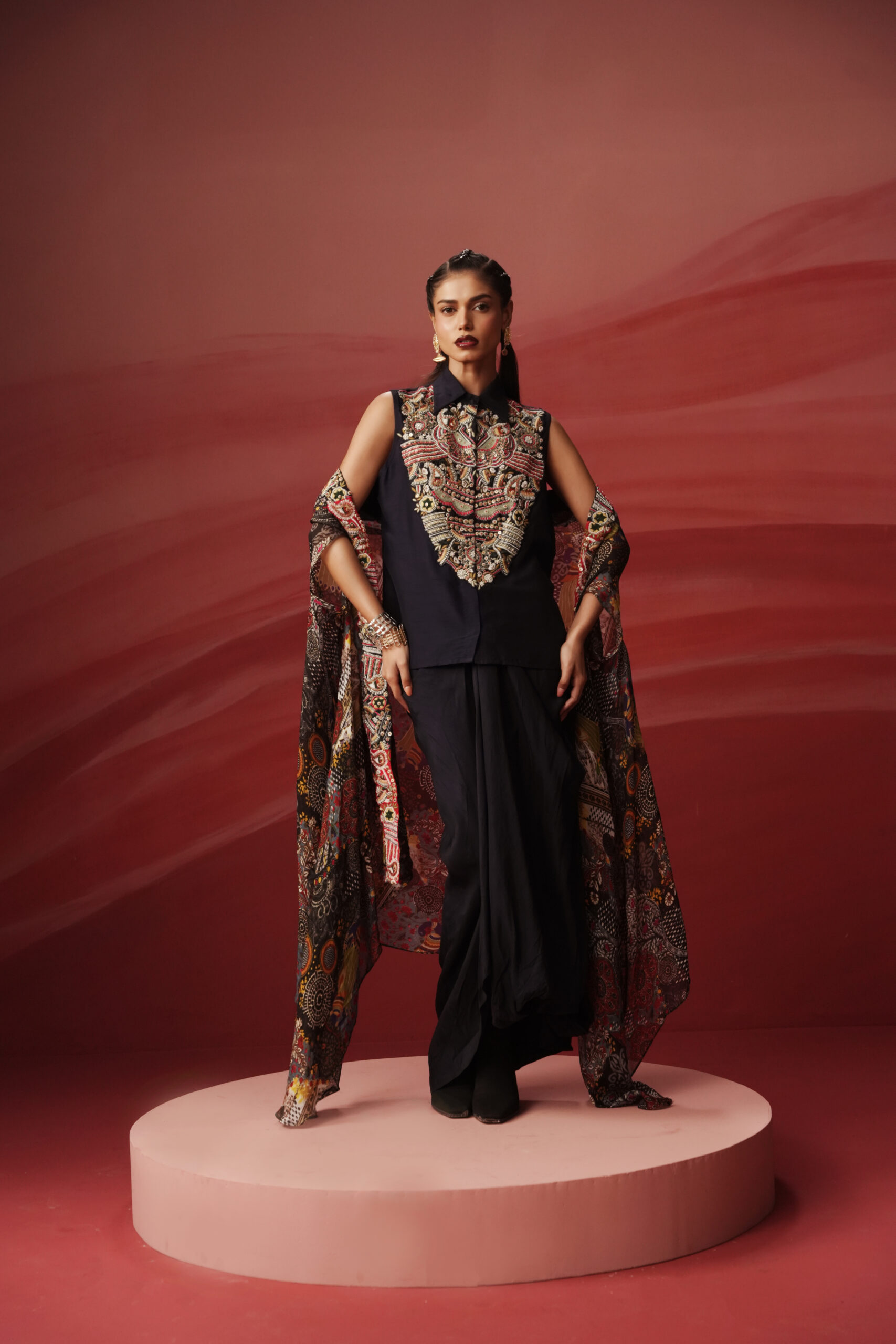 DRAP SKIRT WITH EMBROIDERED SHIRTWITH PRINTED ORGANZA CAPE