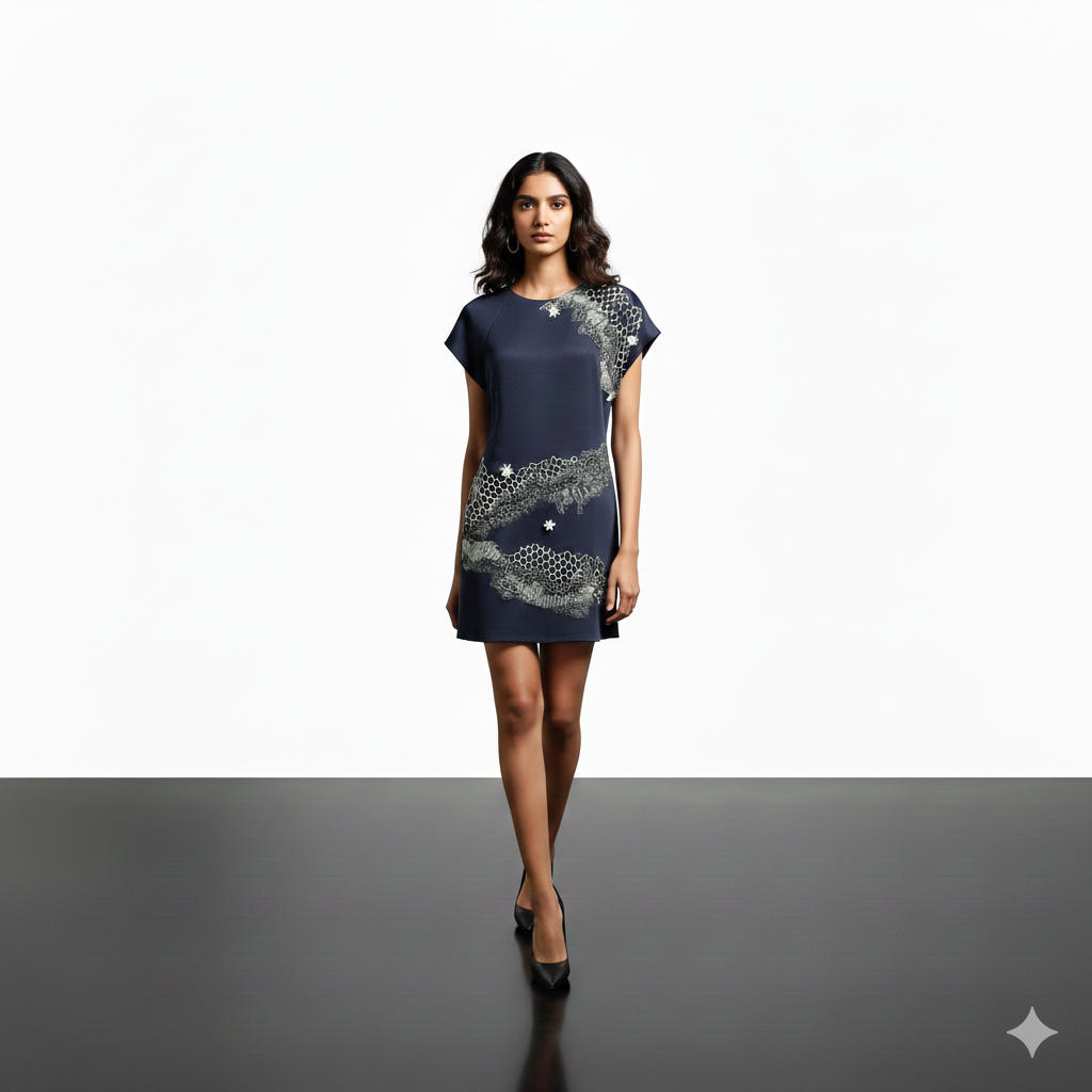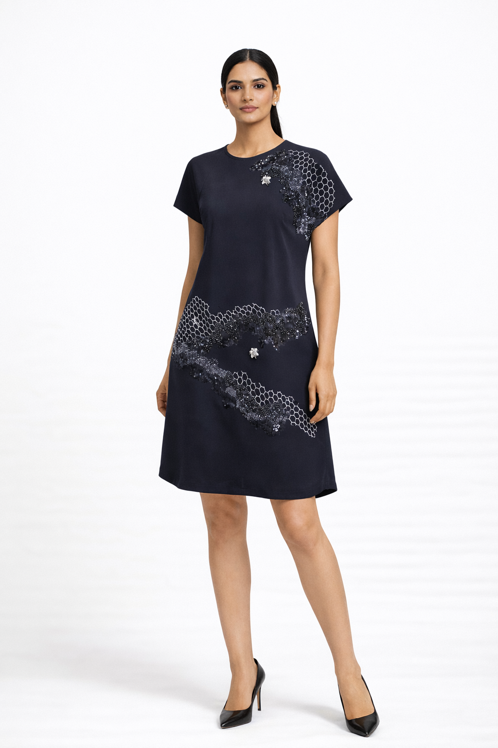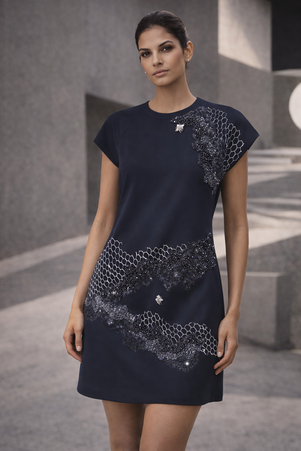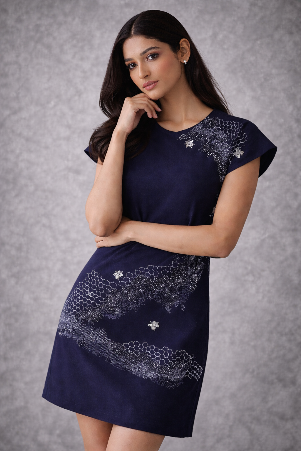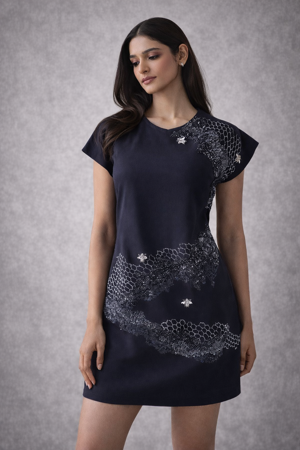 This short dress is crafted from imported fabric and adorned with intricate embroidery featuring bee motifs, honeycomb patterns, and delicate sequins. The shorter silhouette creates a playful yet refined aesthetic.