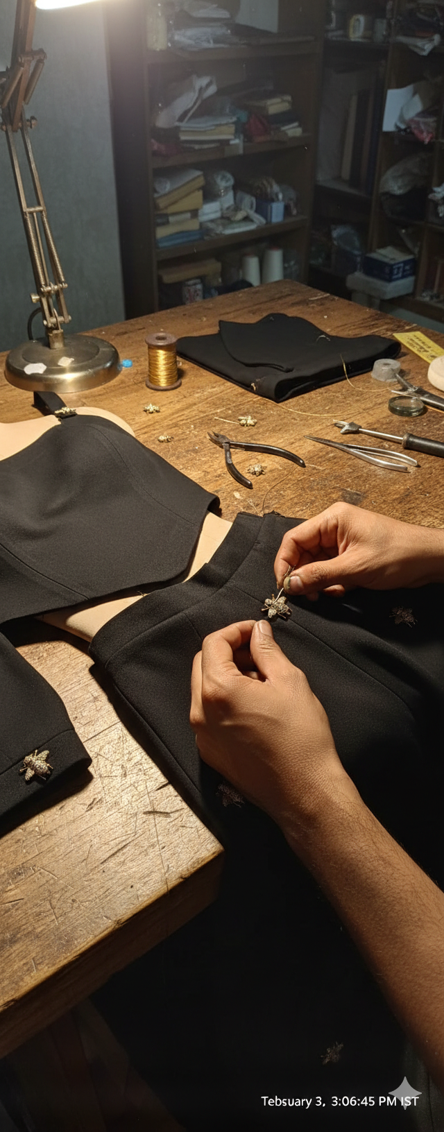 These tailored pants are crafted in imported fabric and detailed with honeycomb inspired embroidery complemented by delicate bee motifs. The structured silhouette creates a refined base while allowing the intricate detailing to stand out.