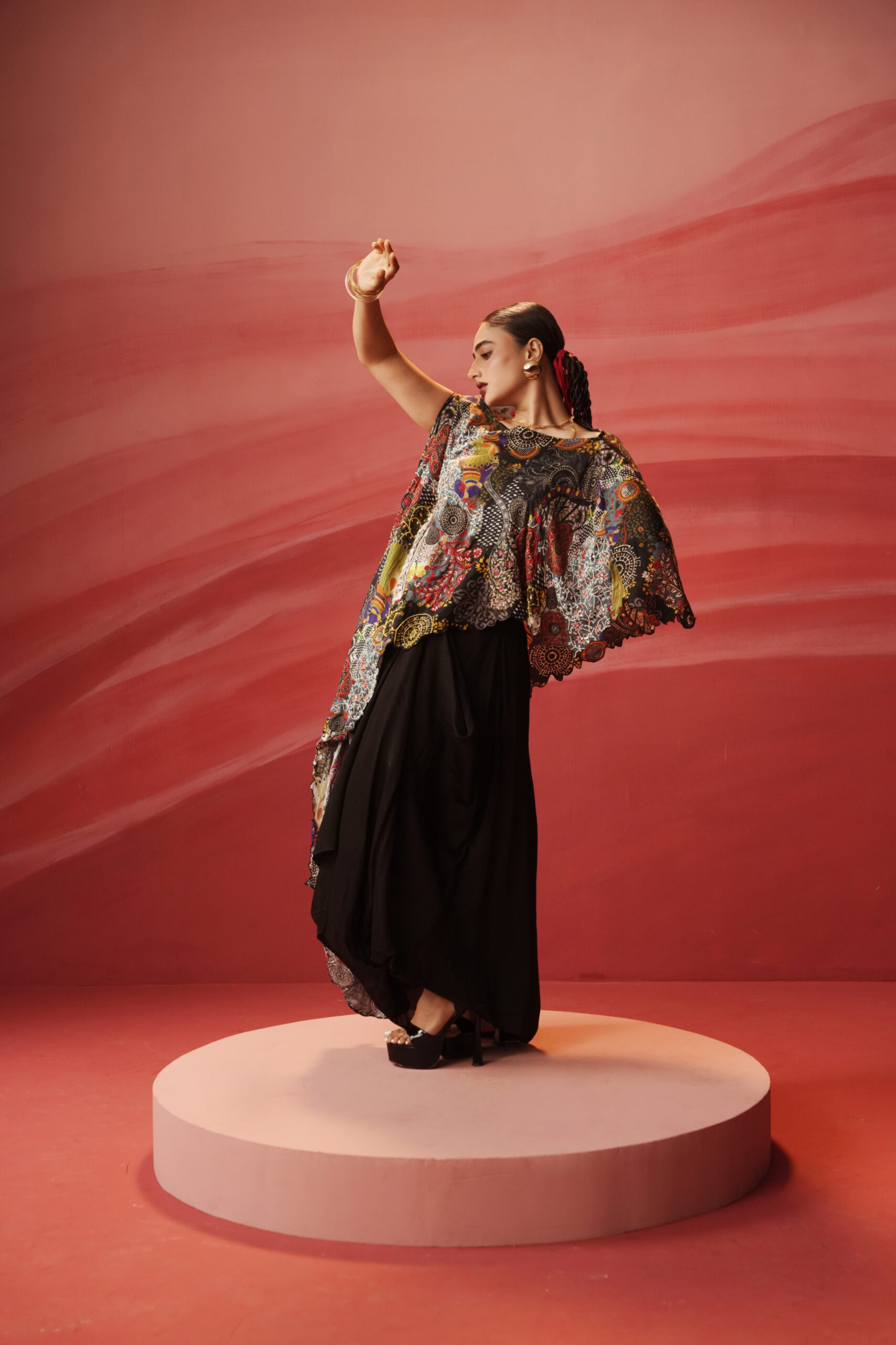 PRINTED BUSTER WITH PRINTED OFF SHOULDER CAPE AND BLACK DRAPE SKIRT