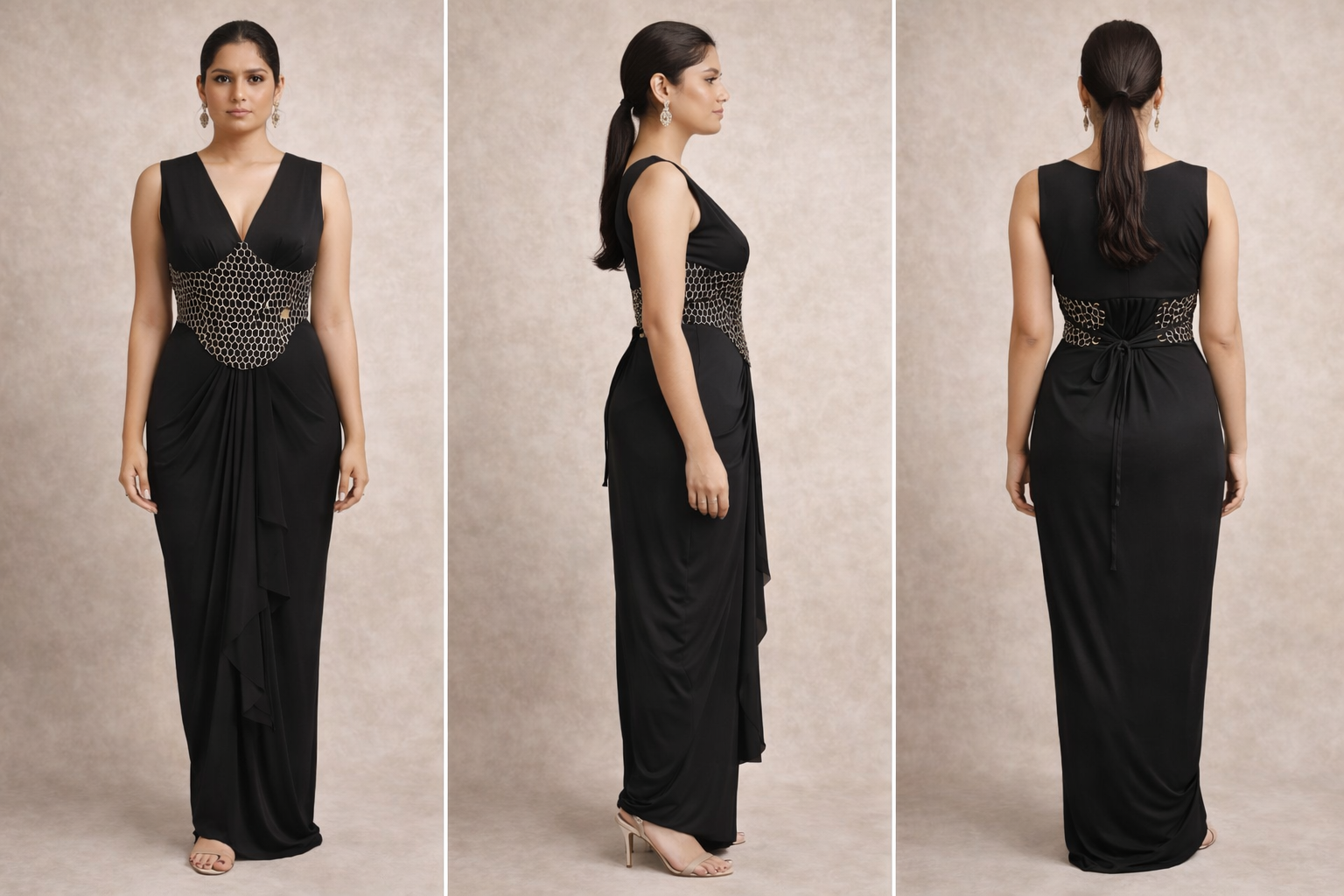 This ensemble features a corset style top crafted in imported fabric and adorned with intricate bee embroidery. The corset structure enhances the silhouette while maintaining refined elegance.