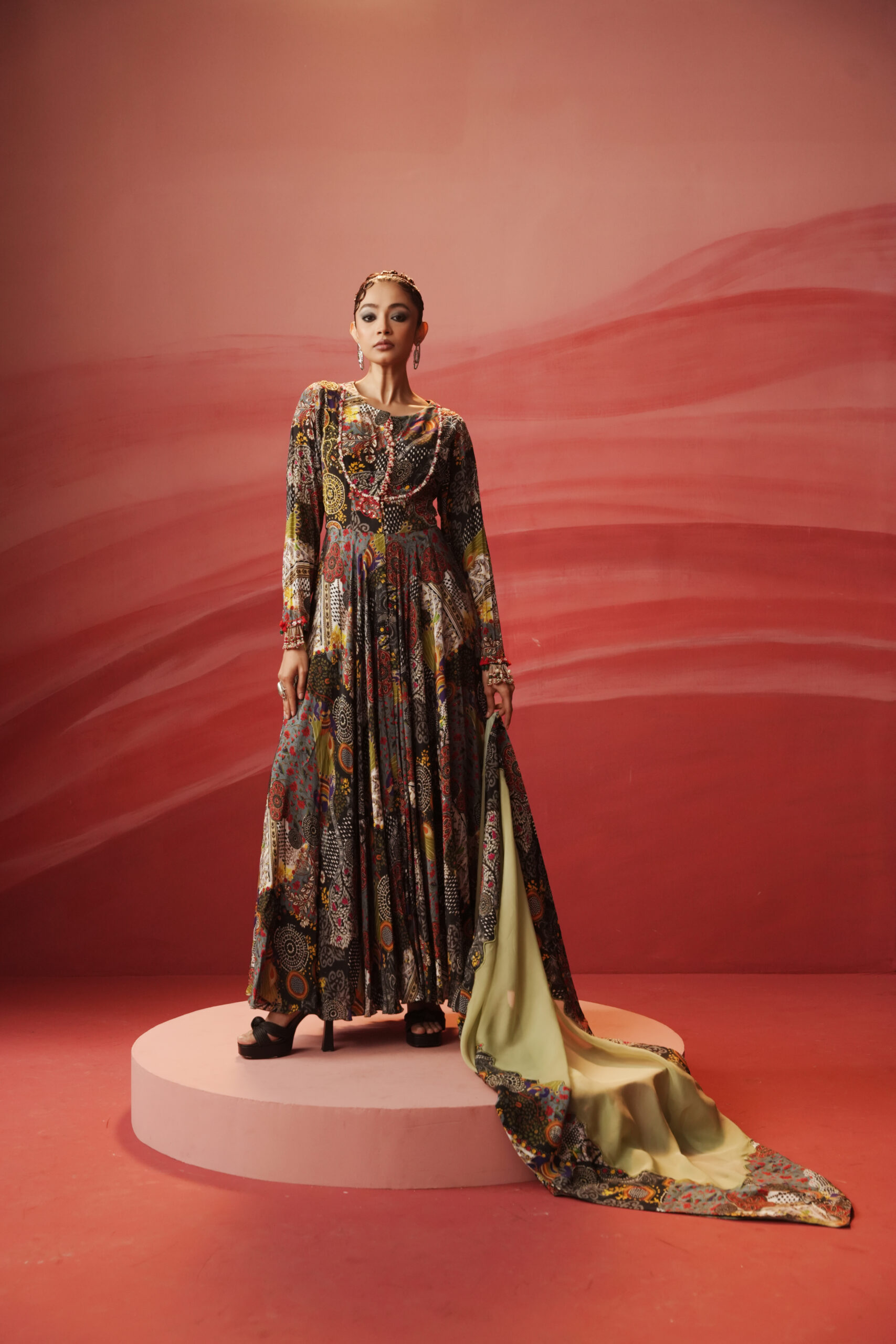 PRINTED FRONT OPEN ANARKALI WITH PRINTED PANTS AND GREEN DUPATTA