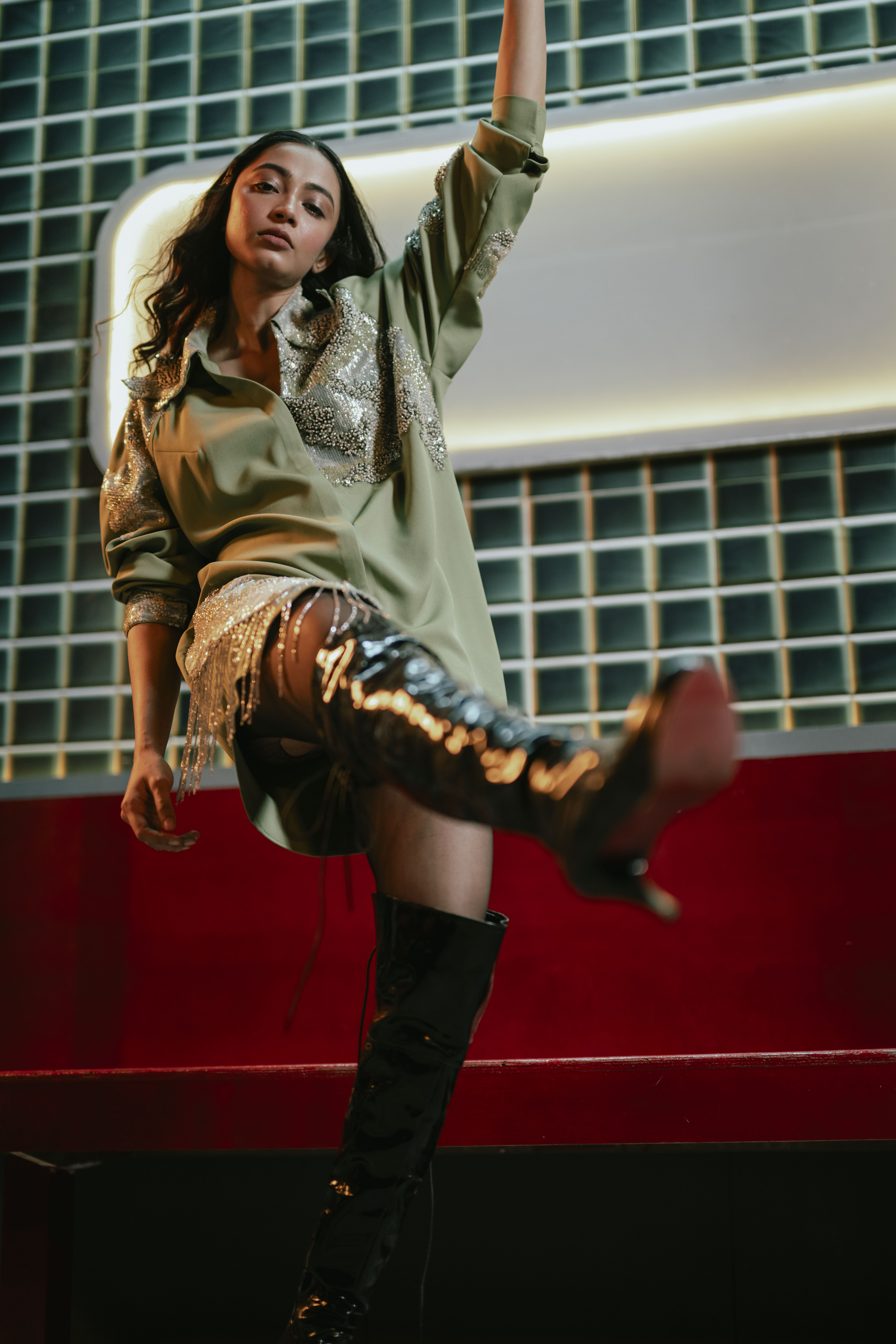 The lycra skirt offers a structured fit that complements the softer form of the top. Together, the pieces create a refined composition that feels contemporary and versatile.