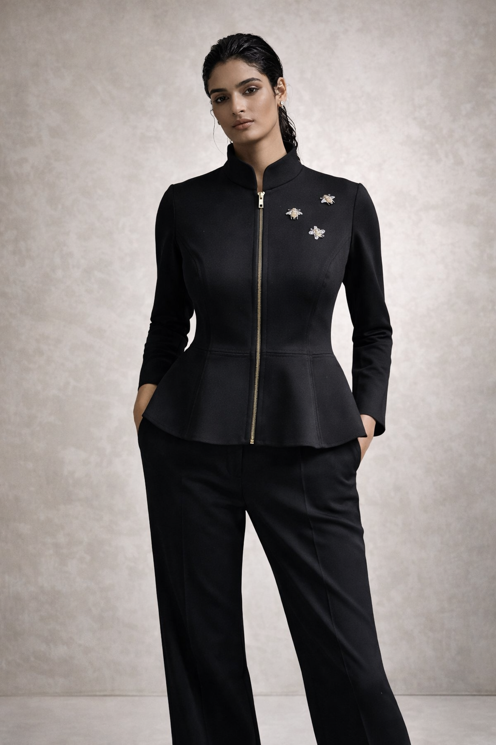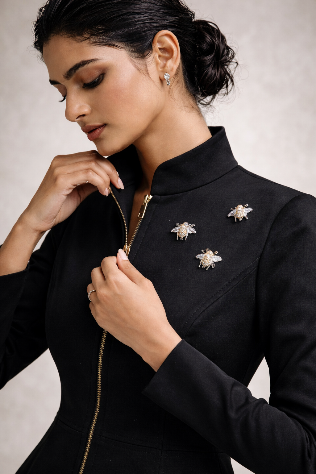 The embroidered bee motifs add handcrafted detailing that enhances the texture of the garment. The contrast between contemporary tailoring and artisanal embroidery creates a striking visual balance.